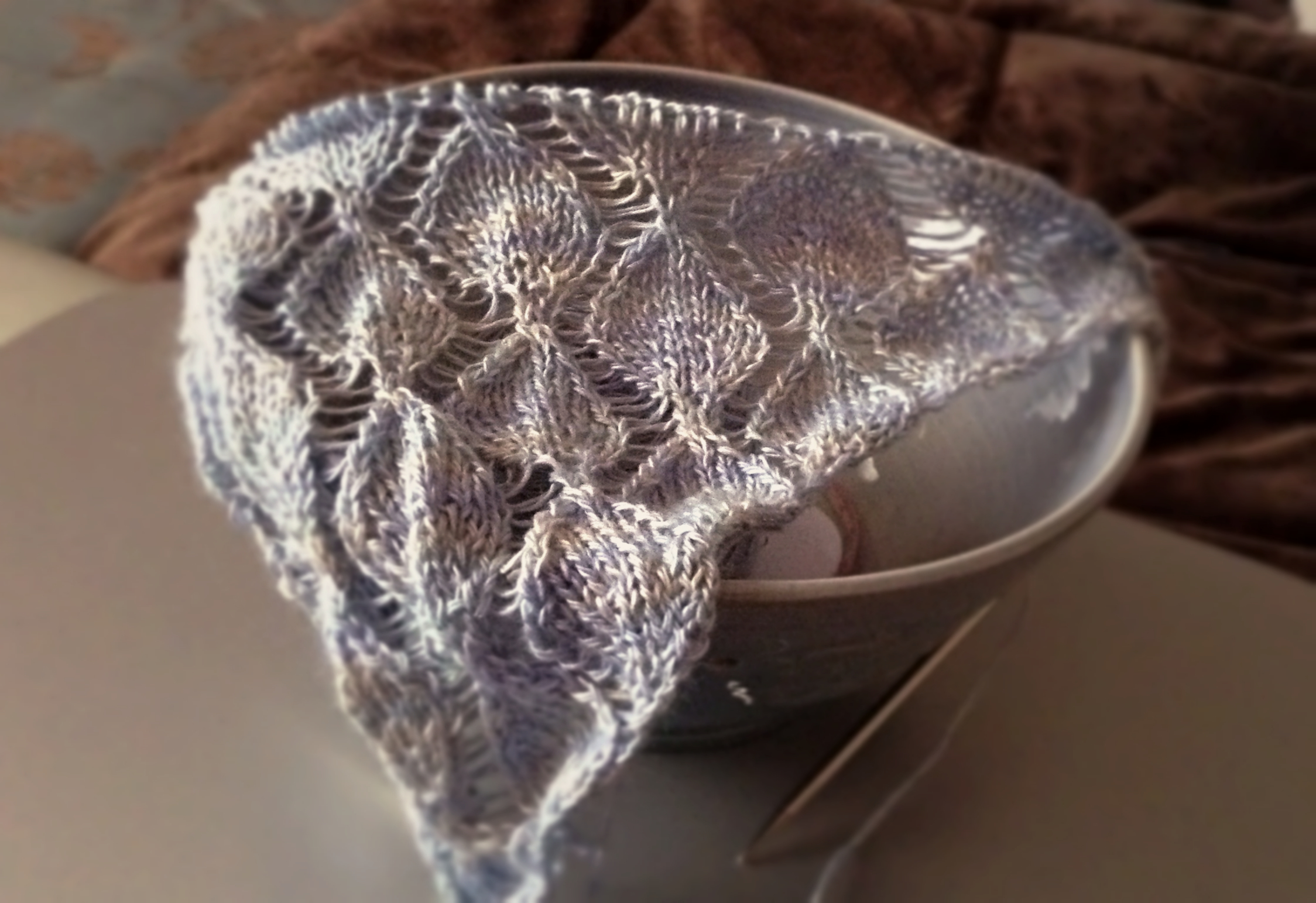Le projet sur lequel je travaille en ce moment est un patron gratuit nommé Elis, mais modifié en chauffe-épaule comme celui de Roko. J’ai du faire des modifications pour arriver au même résultat que celle-ci, car je le tricote avec Silk Halo de Artyarns, l’échantillon était différent puisque cette laine-ci est plus fine. Si vous êtes intéressé par ce projet, voici le lien avec les notes pour la modification.