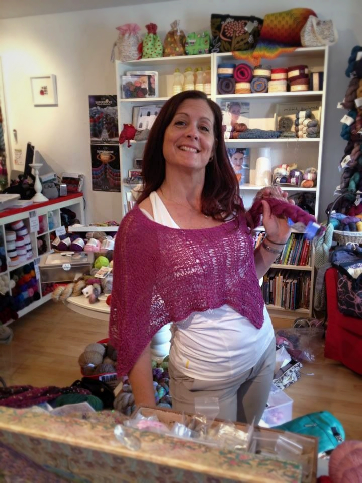Le premier est un patron gratuit (Polaire) de Berroco, dont les photos représentés par la compagnie sont loin d’être flatteuse…..les deux ont été tricoté en Berroco Lago avec des aiguilles 6mm, mais sur la première photo le poncho est porté avec la pointe sur le devant tandis que sur la deuxième photo (prise chez Mont Tricot) on voit le modèle (moi-même) qui le porte avec la pointe sur le côté. Celui ci à été tricoté par Lucinda de chez Mont Tricot.
