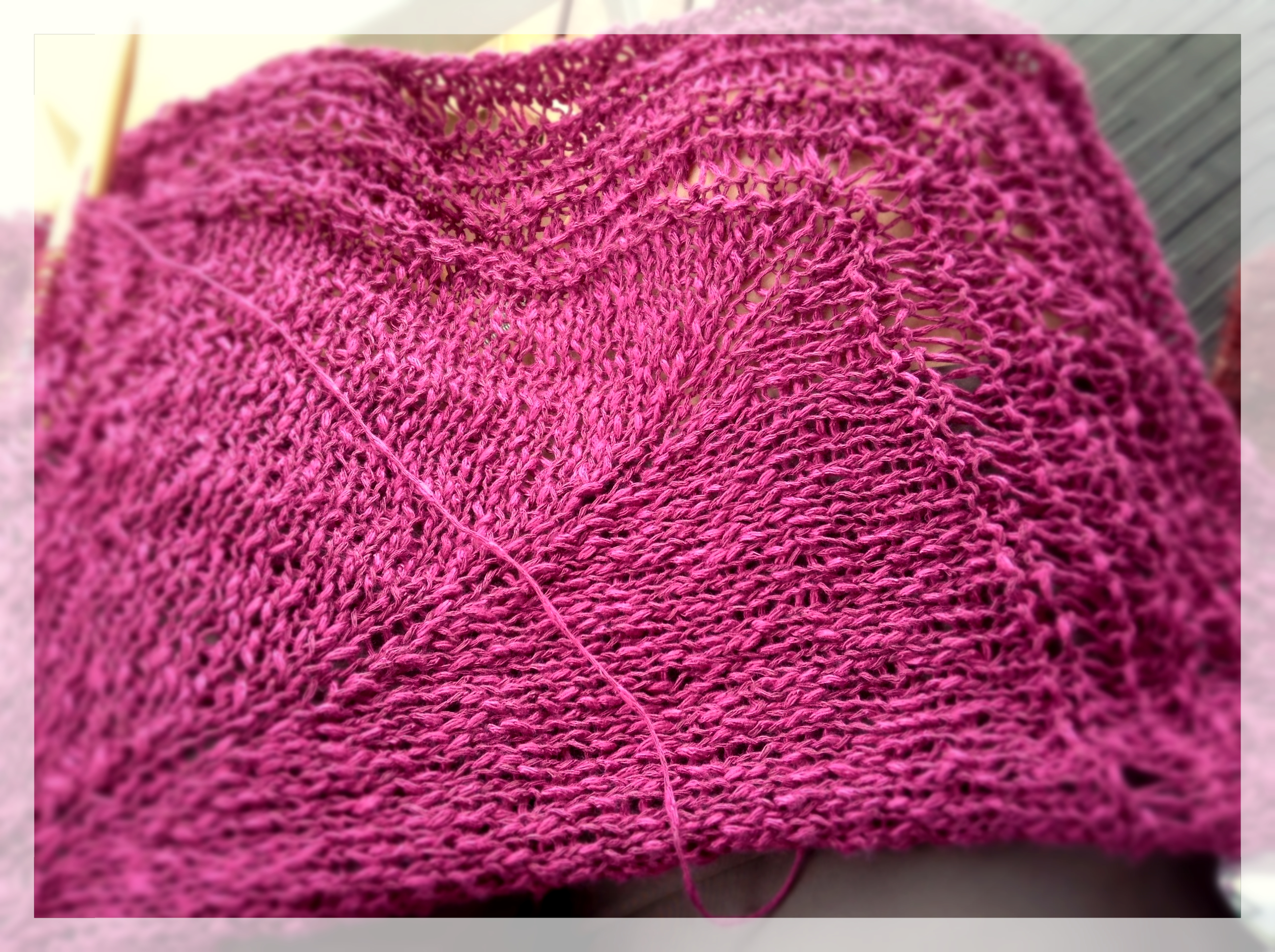 Le projet sur lequel je travaille en ce moment est un patron gratuit nommé Elis, mais modifié en chauffe-épaule comme celui de Roko. J’ai du faire des modifications pour arriver au même résultat que celle-ci, car je le tricote avec Silk Halo de Artyarns, l’échantillon était différent puisque cette laine-ci est plus fine. Si vous êtes intéressé par ce projet, voici le lien avec les notes pour la modification.